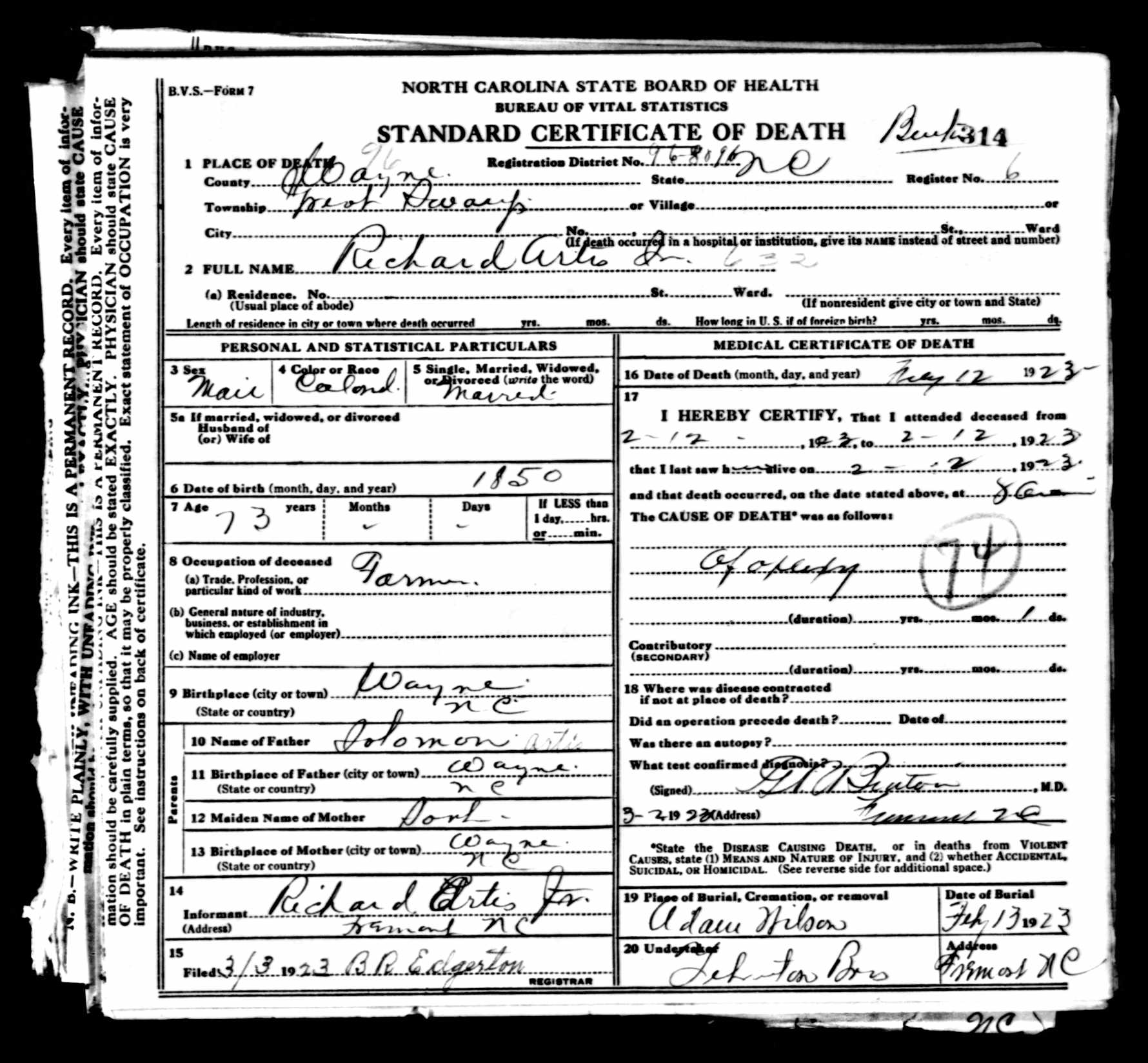 Second, Richard’s father was certainly named Solomon, but not Artis, as unhelpfully pencilled in.