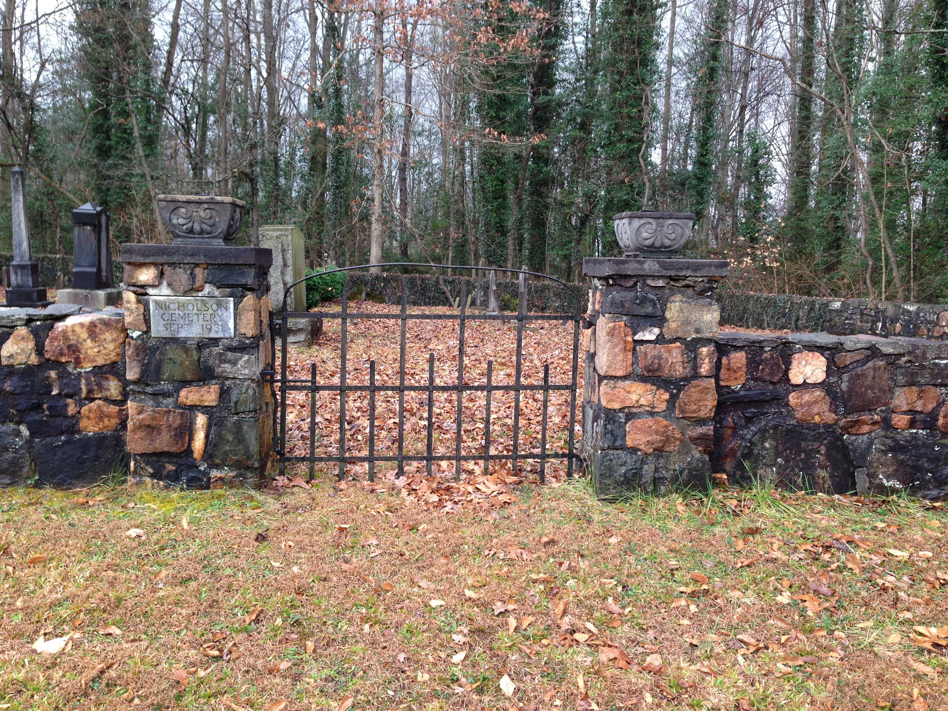 My great-great-great-great-great-grandfather James Nicholson bought a mill on the creek in the late 1820s and probably established the graveyard. His father, Revolutionary War veteran John Stockton Nicholson, who was born 1757 in Princeton, New Jersey, and migrated to North Carolina circa 1800, is buried Muddy Creek Friends cemetery, Kernersville, North Carolina. He died in 1838.