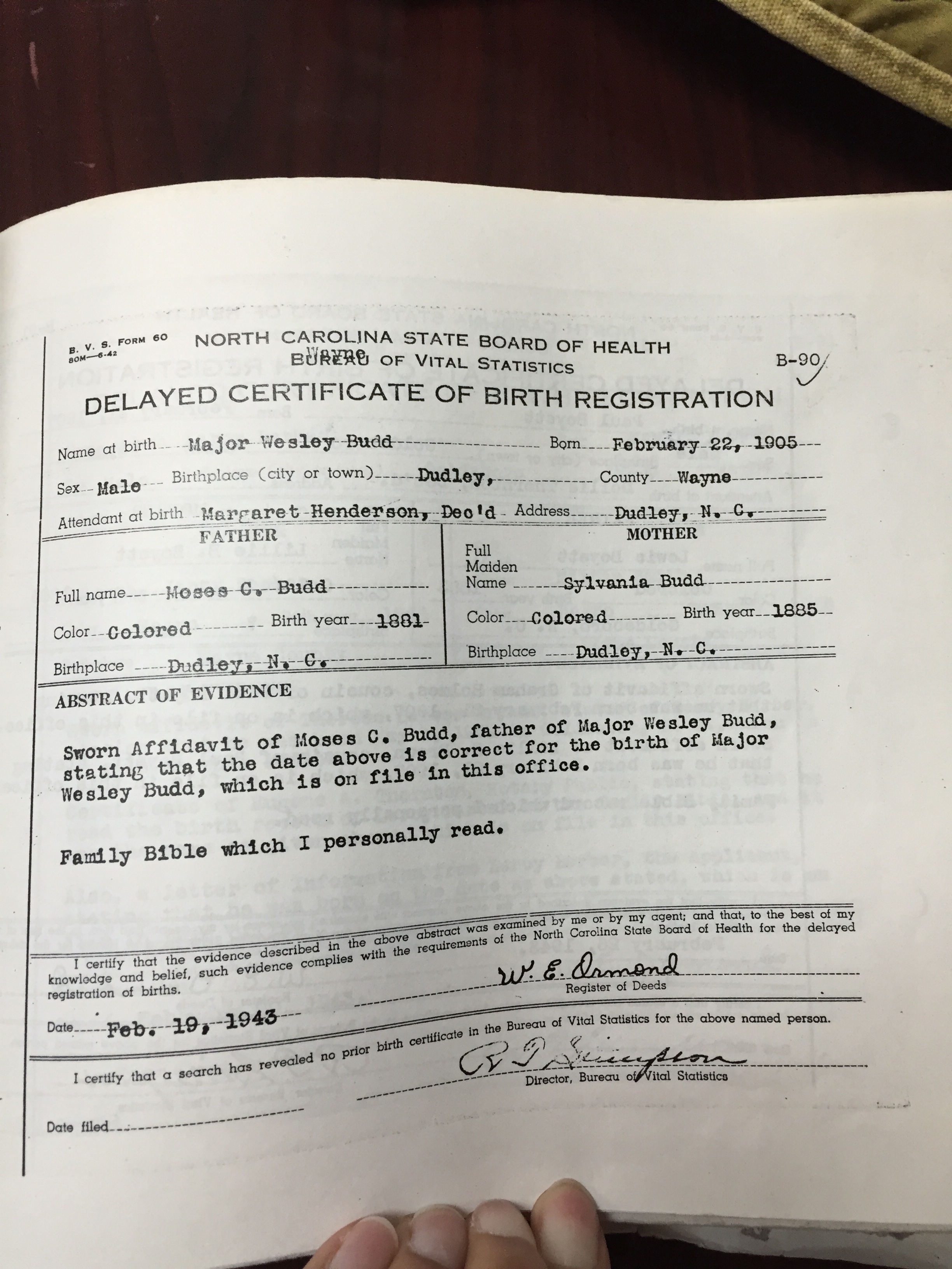 When I was home last week, I had some time to kill, so I spent an hour or so in the Wayne County Register of Deeds office, flipping through Delayed Birth registers. North Carolina did not mandate vital records until 1913, but people born before that year could obtain a “delayed” certificate if they could provide certain proof of their birthdate.