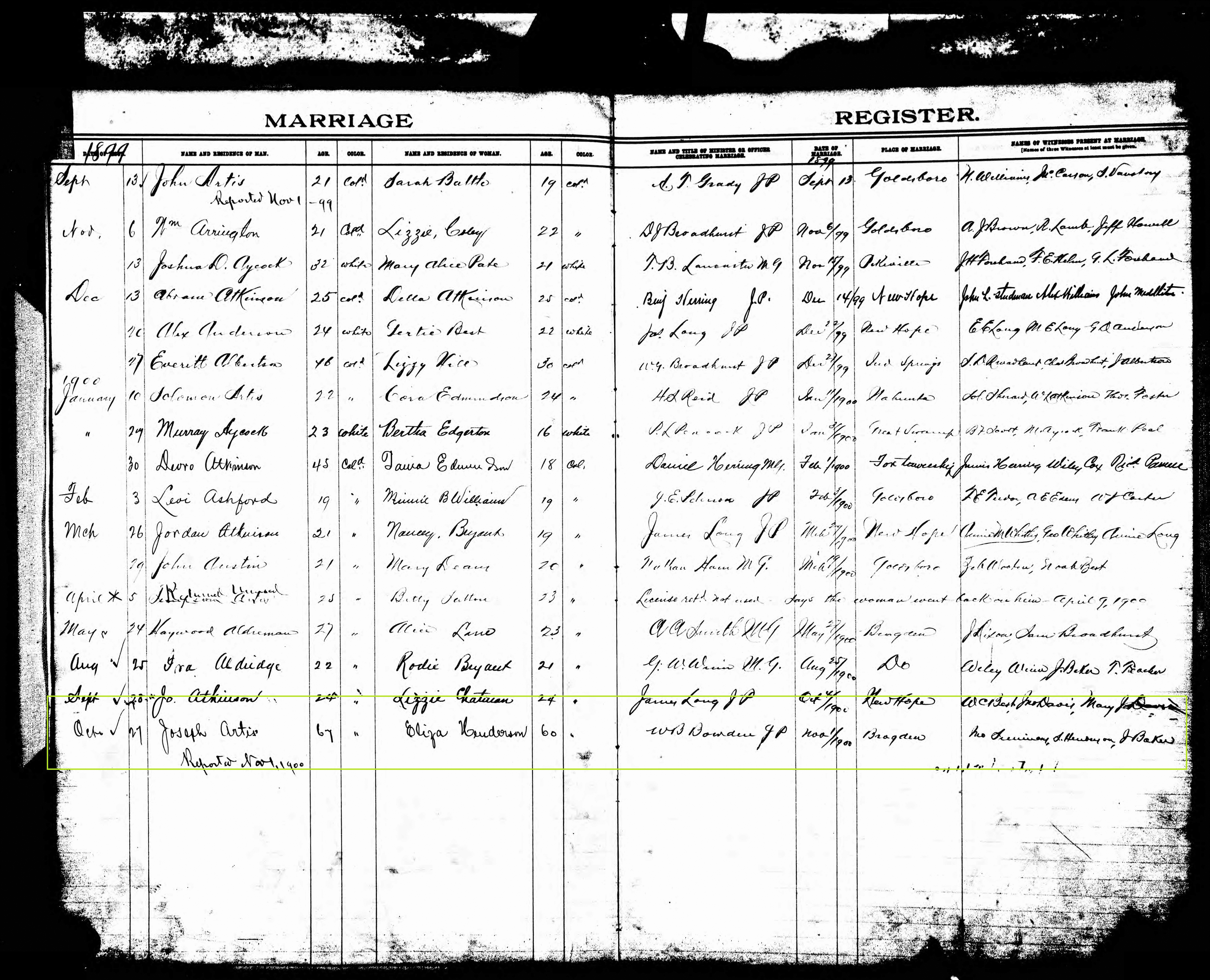 Joseph Artis I readily find. He was born circa 1830 to Absalom and Clarky Artis in northwest Wayne County. He married Mary Ann (last name unknown), and they and their children appear together in the 1860, 1870 censuses of Buck Swamp, then Brogden, townships. I don’t find him at all in 1900.