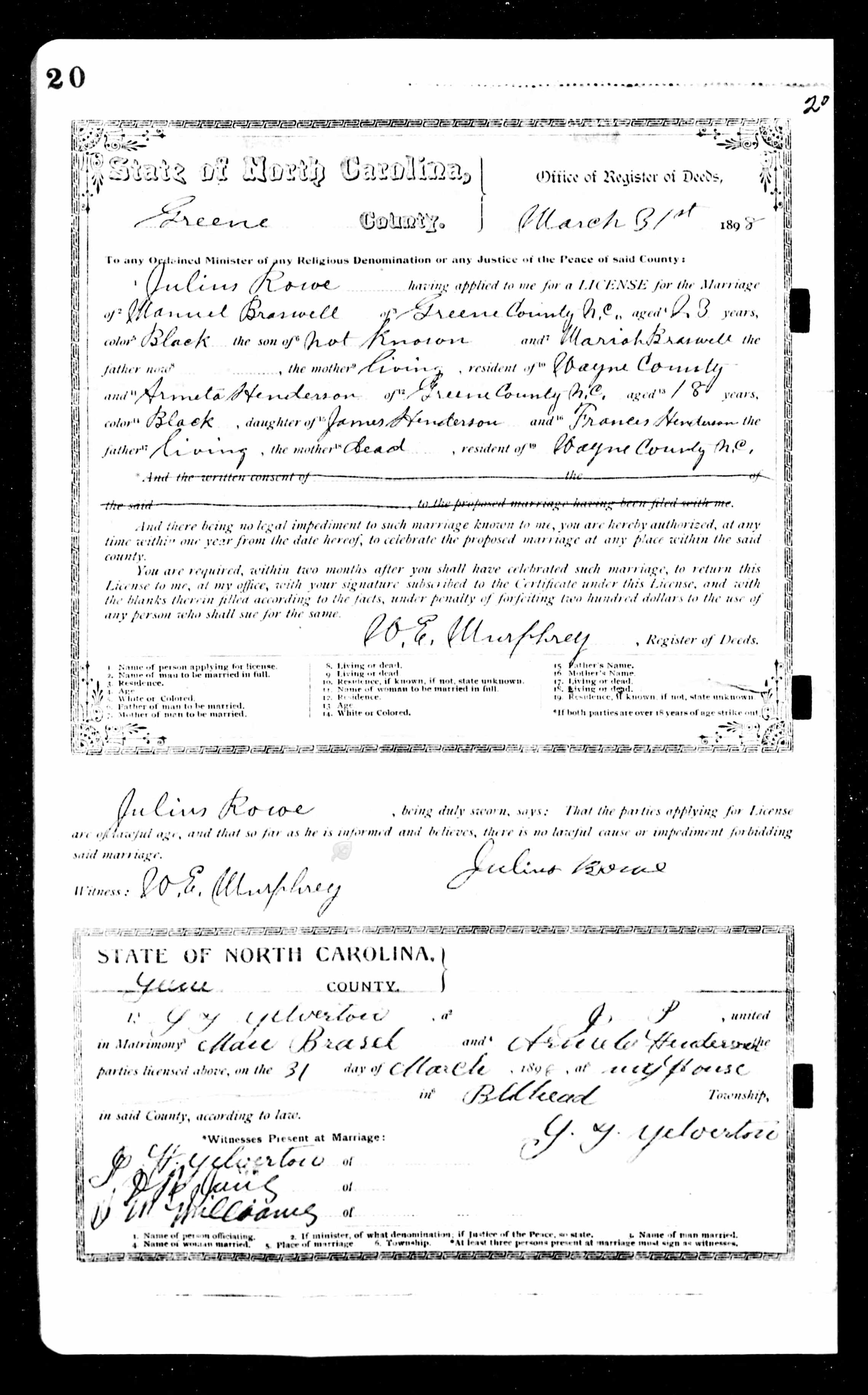 On 31 1898, 18 year-old Amelia Henderson married Manuel Braswell in Bullhead township, Greene County, North Carolina. Their license noted that she was a Wayne County resident, and, assuming she was still living in her father’s household in the far south of the county, I’m not sure how she would have met Braswell.