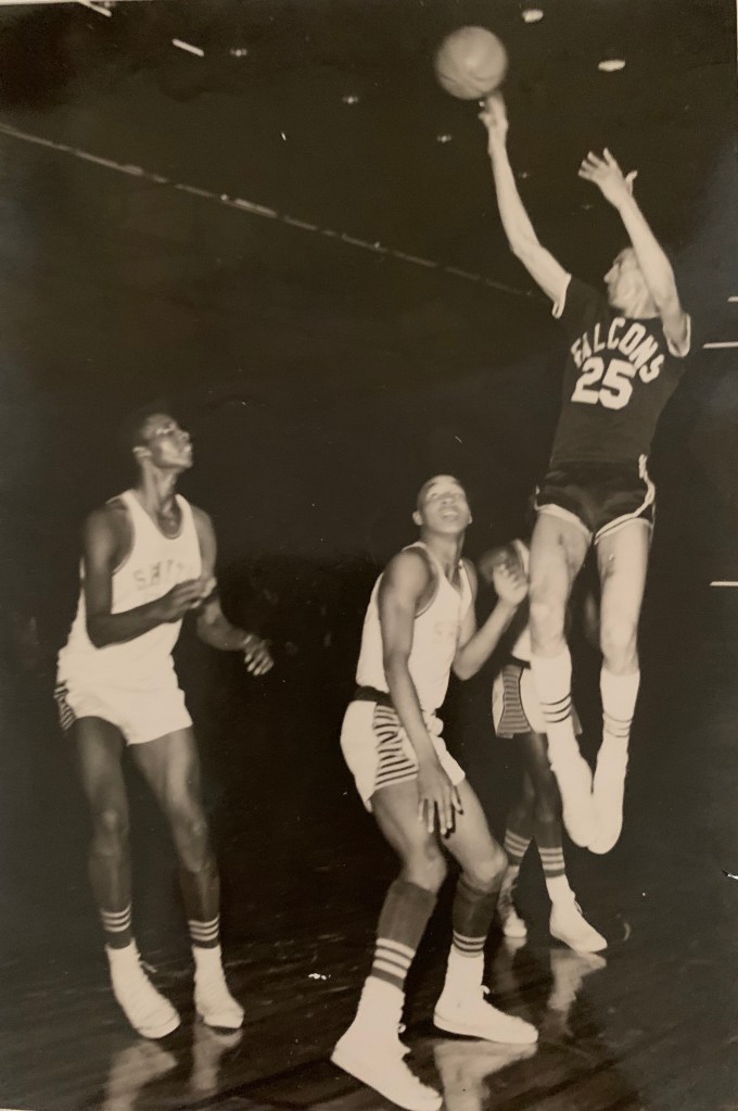 Today is my father’s 86th birthday, and I’m grateful to be able to spend it with him. He was a storied high school basketball coach in North Carolina and played the game in high school, college, and the Air Force. Here, as a center on Saint Augustine’s College’s team, he takes a jumper over future Globetrotter Curley Neal.