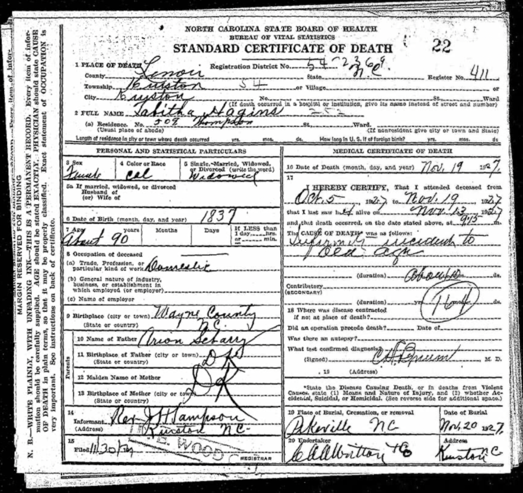 I’m not sure how I missed this death certificate for Tabitha Hagans, another child of Aaron Seaberry! More soon as I explore this new clue.