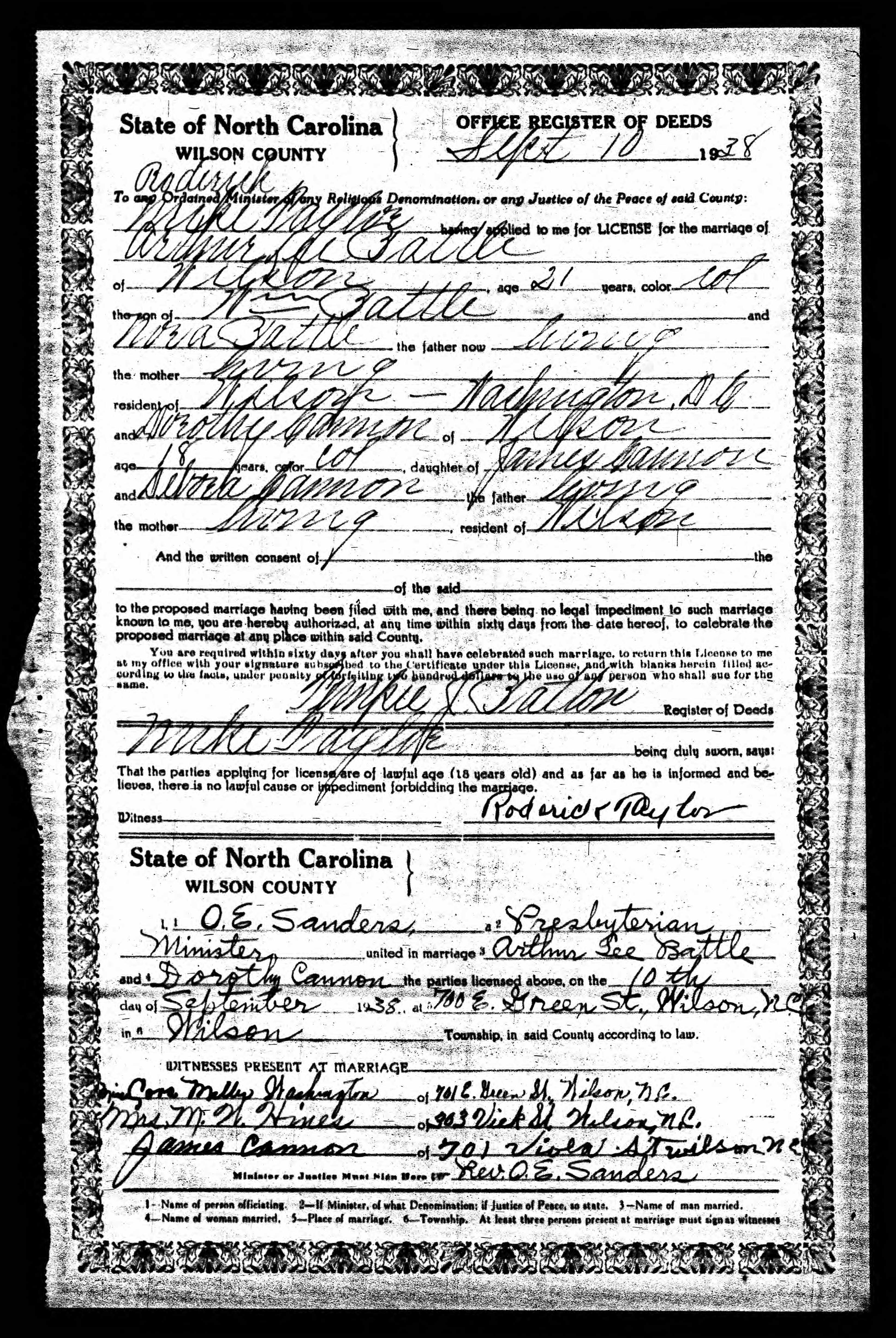 I happened upon the 10 September 1938 marriage license for Arthur Lee Battle, 21, and Dorothy Cannon, 18, in Wilson. My grandfather Roderick “Mike” Taylor applied for the license. What was his relationship to the couple? Was Arthur Battle, whose parents were William and Nora Battle, related to Taylor, whose maternal grandmother was Cherry Battle Barnes?