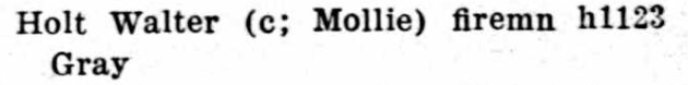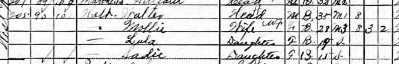 In the 1920 census, Walter Holt, age 38, foreman for Southern Rail Road, headed a household that included wife Mollie, 39; nephews Bazel, 23, and William, 20; niece Novella, 18; a boarded named Mildred Smith; and “step daughter” Sadie Holt, who described herself as a widow. I have not found a death certificate for Ashley Whitfield. I did find this though: