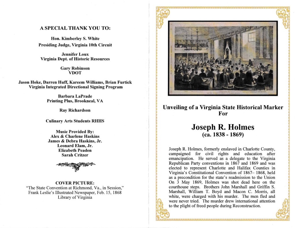 “First, I’d like to recognize my family, Joseph R. Holmes’ family, here today — including three of his brother Jasper’s great-granddaughters. Some here may remember their uncle, Dr. J. Maxwell Allen, who practiced dentistry in Charlotte Court House. His sister, my great-aunt Julia, first told me of Joseph Holmes when I was an inquisitive teenager digging for my roots. She did not know the details — only that her grandfather’s brother Joseph, born enslaved, had been killed because of his political activity. That was enough, though, to set this journey in motion.