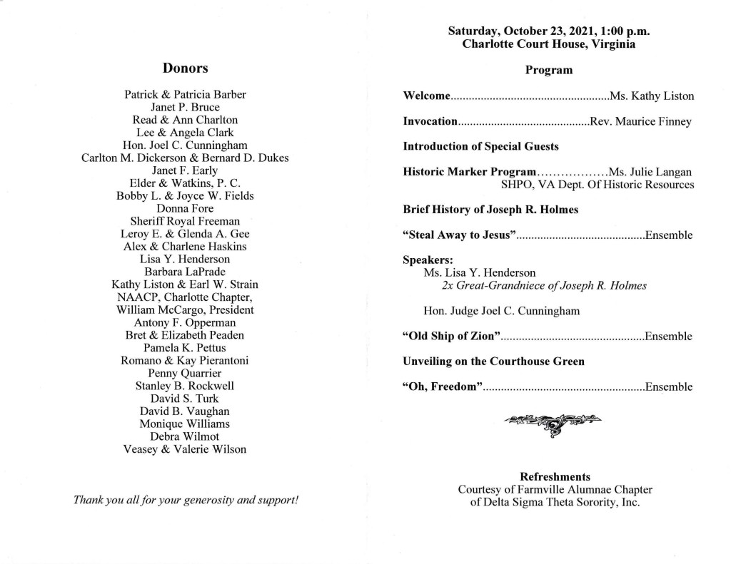 “On behalf of the Holmes-Allen family, I extend thanks to all who made this day possible. So many in Charlotte County gave in so many ways — time, money, influence, prayer (look at God!) — and we are profoundly grateful for your embrace and support of this project. “We are also grateful to Kathy Liston. When I reached out to Kathy nearly ten years ago, seeking help to find the truth of Joseph Holmes’ life, I did not even dream of this day. I first visited Charlotte Court House in 2012 at Kathy’s invitation. She took me to Joseph Holmes’ homestead; to Roxabel, the plantation on which he may have been enslaved; to the school at Keysville whose establishment he championed; and finally to this courthouse, to the very steps on which he bled and died. The historical marker we reveal today stands as a testament to Kathy’s persistence and insistence, her values and vision, her energy and expertise, and we cannot thank her enough.