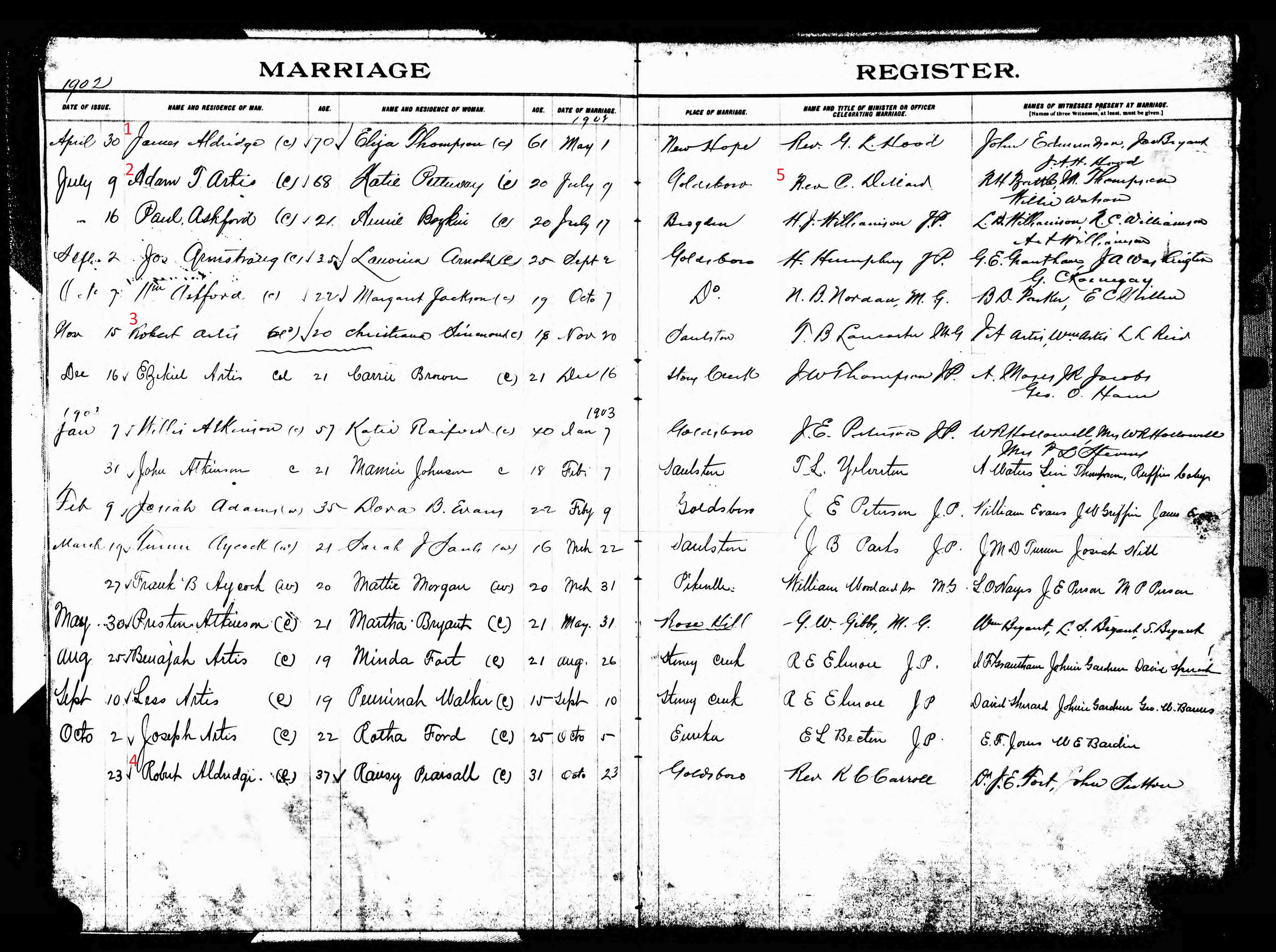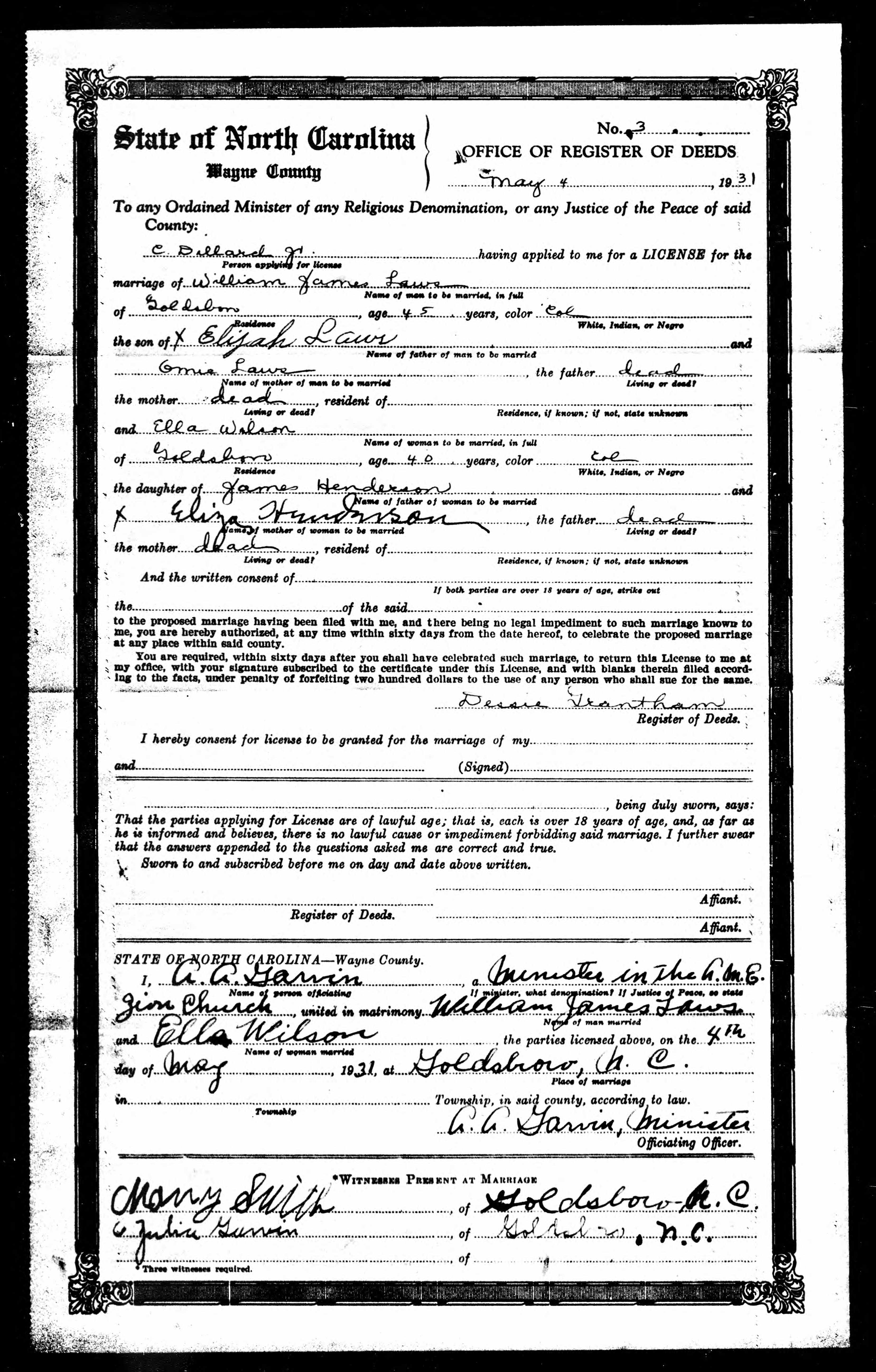 Back before I completely fell off the 52 Ancestors Challenge, I wrote a piece about my great-great-grandmother Loudie Henderson‘s sister Louella. The gist of it was that, other than the 1880 census and my grandmother’s recollections, there were no sure sightings of this woman. But Ancestry’s new North Carolina Marriages collection is paying off for me in a big way, and the first cha-ching was Aunt Ella’s license for her marriage to William James Laws in 1931. The collection is indexed by parents, as well as bride and groom, and a search for James Henderson picked the record up. I’m elated, but thrown. The last husband my grandmother remembered was Wilson, but he clearly was not the end of the line for Ella. (And 40? Please. By 1931, she was pushing 55.) The witnesses: is that “Mary” Smith? Or “Nany” Smith, i.e. Nancy “Nannie” Henderson Smith Diggs, Ella’s sister. Nancy’s second marriage, to Patrick Diggs, was short-lived, and in the 1930 census, she had reverted to Smith. And which A.M.E. Zion church?
