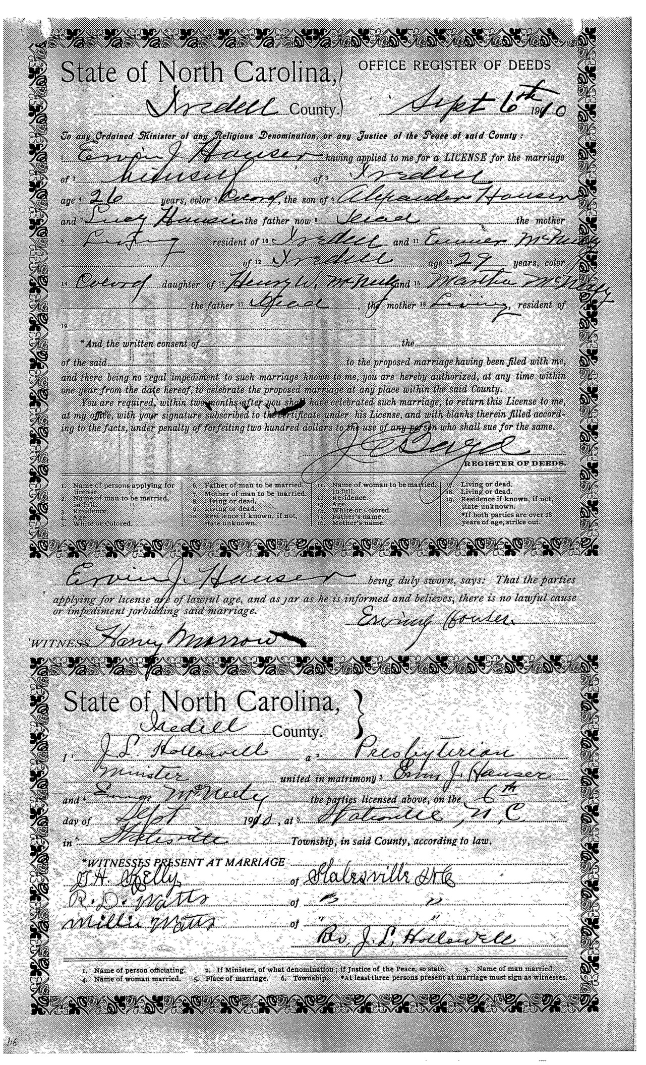 Irving L. Houser was born in 1885 in Iredell County to Alexander “Dan” and Lucy Houser. He and Emma McNeely were married 6 September 1910 in Statesville. The couple migrated to Bayonne, New Jersey, and settled on Andrew Street.