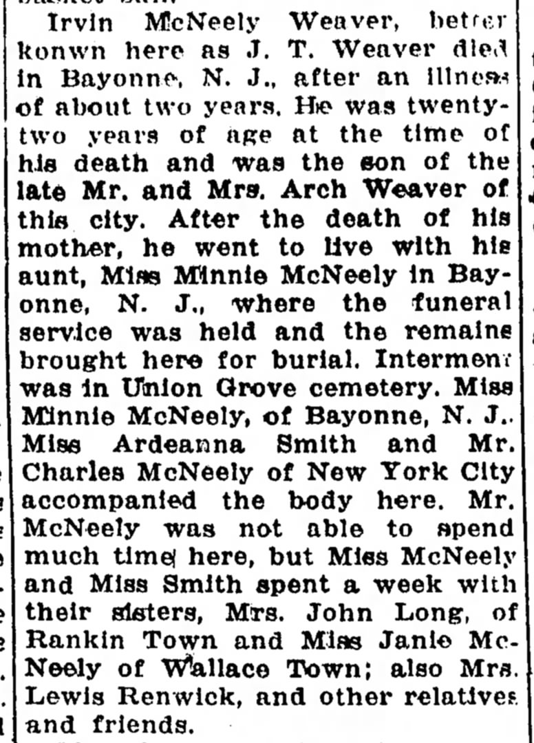 As Grandma Carrie so memorably said, “Well, I’ll be damn.” Here was J.T., as last. Not James McNeely — much younger, in fact — but Irvin McNeely Weaver. (The same “mysterious” Irving McNeely listed in the 1930 census in Martha McNeely‘s Bayonne household. He was described as her nephew, rather than her grandson, and I jotted in my notes: “Who is this???”) My grandmother was married and living in Newport News, Virginia, at the time of his death, and is not among his named survivors. Ardeanur Smith was his cousin, not his aunt, and Charles McNeely was his brother. Mrs. John Long was his aunt Lizzie McNeely Long, and Mrs. Lewis Renwick was his cousin Louise Colvert Renwick.