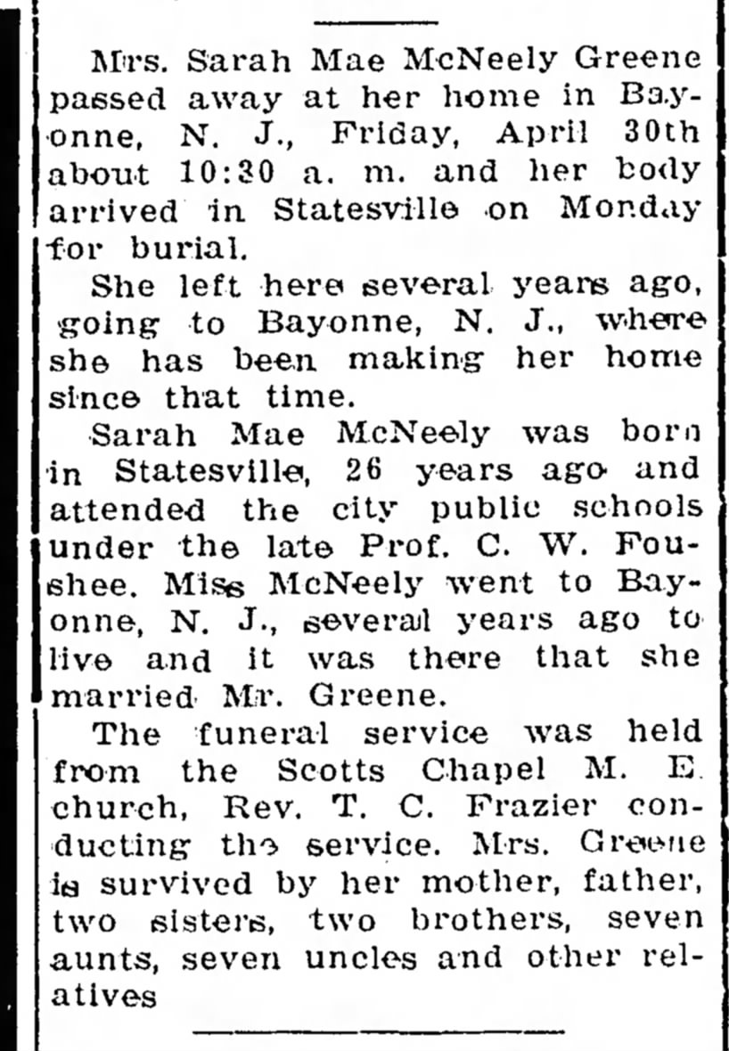 Sarah worked with her mother and sister at Statesville Laundry in the early 1930s. Soon after, she joined her grandmother, uncle John, aunt Emma and cousins in Bayonne, New Jersey, where she married a Mr. Green. (No one, including her obituary writer, seems to know his first name.)