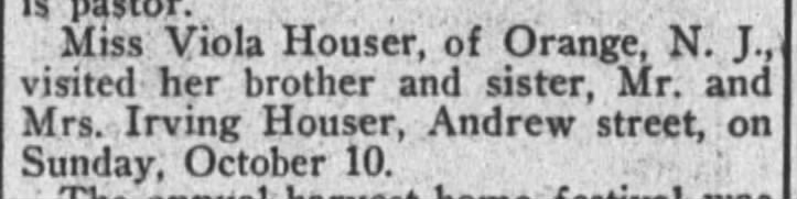 Miss Viola Houser, of Orange, N.J., visited her brother and sister, Mr. and Mrs. Irving Houser, Andrew Street, on Sunday, October 10.