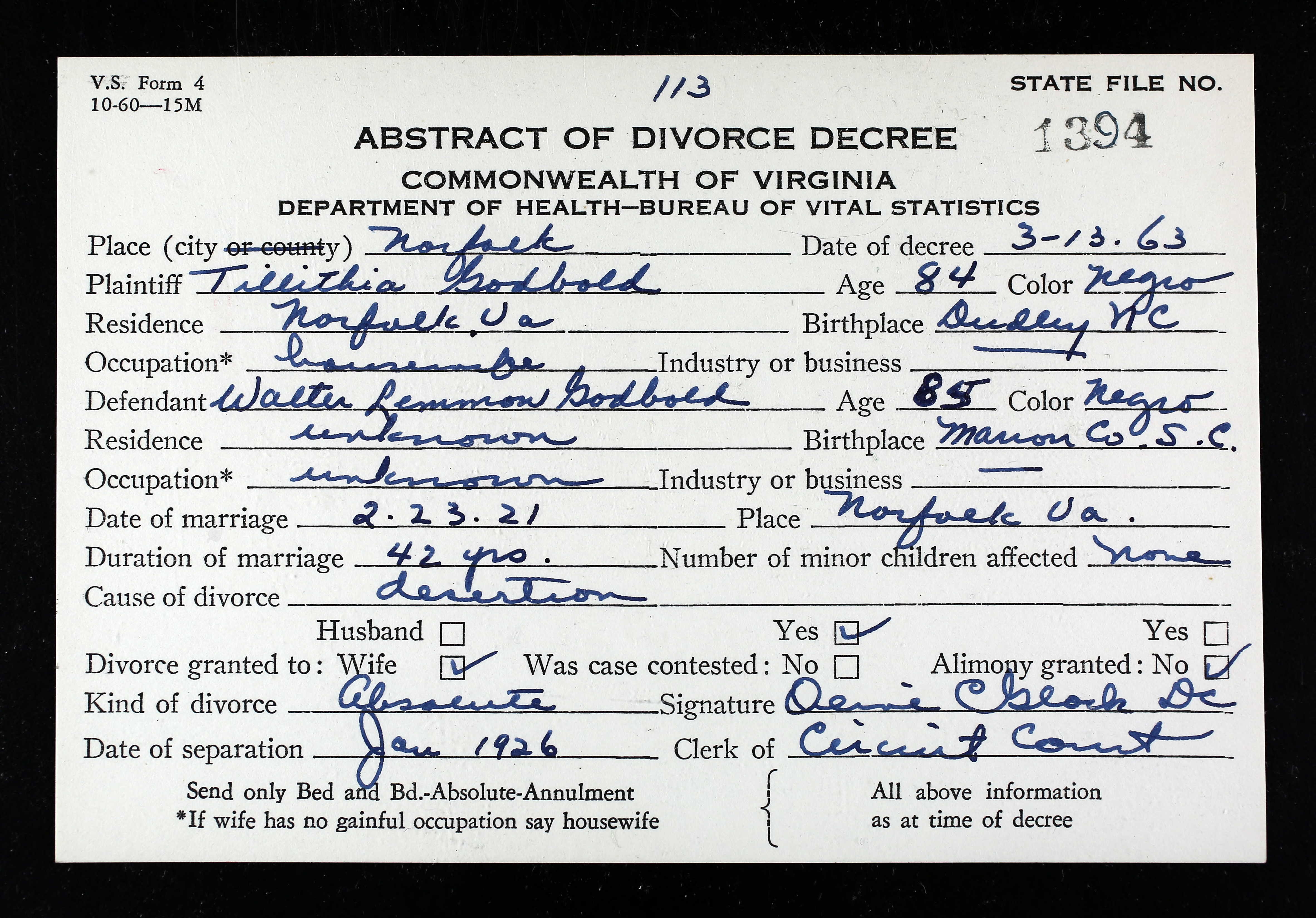 And what could have led an 84 year-old woman to seek a divorce from a man she probably had not seen in decades? A third shot at love. Less than a month after her marriage to Godbold was dissolved, Tilithia married John Carter Dabney, a retiree nearly twenty years her junior.