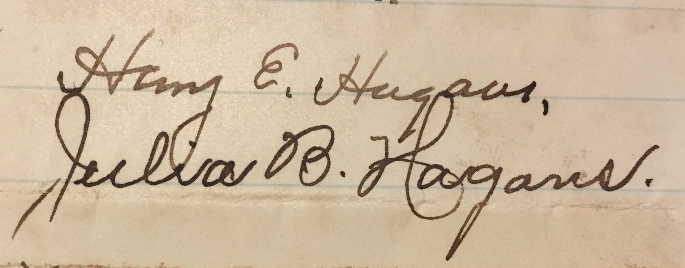 Henry E. Hagans spent much of his life as a teacher and principal, and his small, firm hand reflects his pedagogical life. He likely met his wife, Julia B. Morton of Danville, Virginia, at Howard. This sample of their signatures is on a deed dated 1899.
