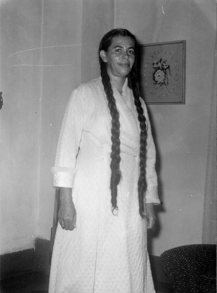I got a plait of [Hattie’s] hair and a plait of my mama’s, Bessie’s hair, and then mine. I was looking at that the other day, and I looked at it, and I said, “Huh, it was that long?” Rudy, Rudy Farmer took that picture. ‘Cause I – He saw my hair. I was standing there with my housecoat on. I still got that thing now. And, “Goodness! I didn’t know your hair was that long!” We were staying on Reid Street. And he said, “I’d sure like to have a picture of that.” And I said, “Well, you got a Kodak?” And he said, “Yeah! You’d let me take a picture?” I said, “Yeah.” And so he went home and got it and took a picture of it. I was standing up in one and sitting down in one.