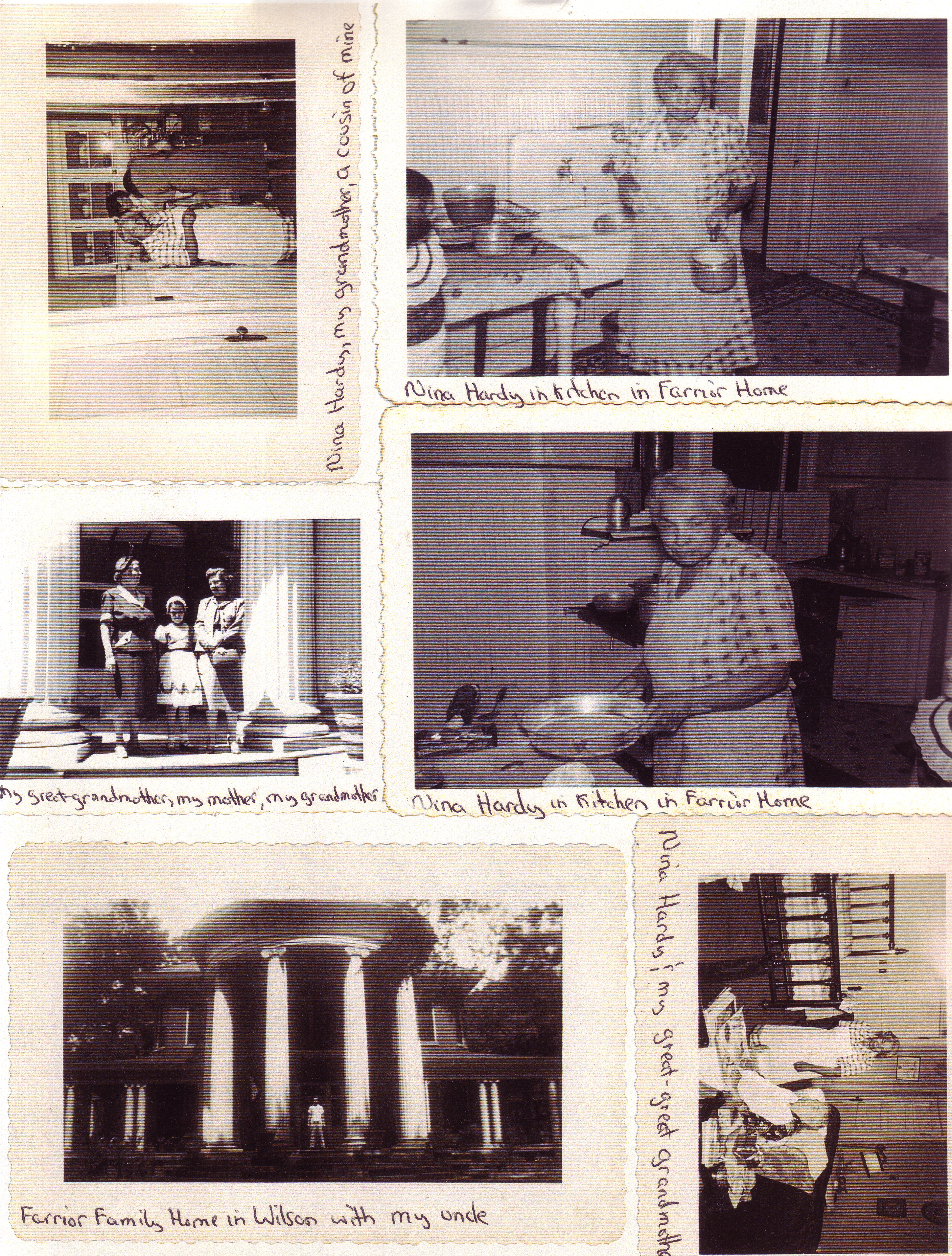 … these touch me. Nina at work. Nina in a kitchen with a floured pan, perhaps making biscuits, perhaps the dumplings my grandmother relished. Nina, her own legs aching, tending to whitefolks. The columned Farrior mansion, since torn down, with Nina’s little room tucked out of sight.