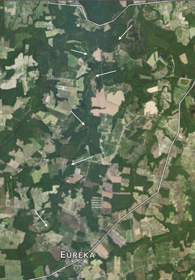 Other landmarks on the field map: (4) Toisnot Swamp (marked Creek here), a tributary of the Contentnea that flows down from Wilson County; (5) Contentnea Creek itself; (6) Black Creek, another Wilson County tributary; (7) Aycock Swamp, another tributary, upon whose banks Adam Artis’ brother-in-law and Appie Ward’s husband Napoleon Hagans built his house; and (8) Turner Swamp.